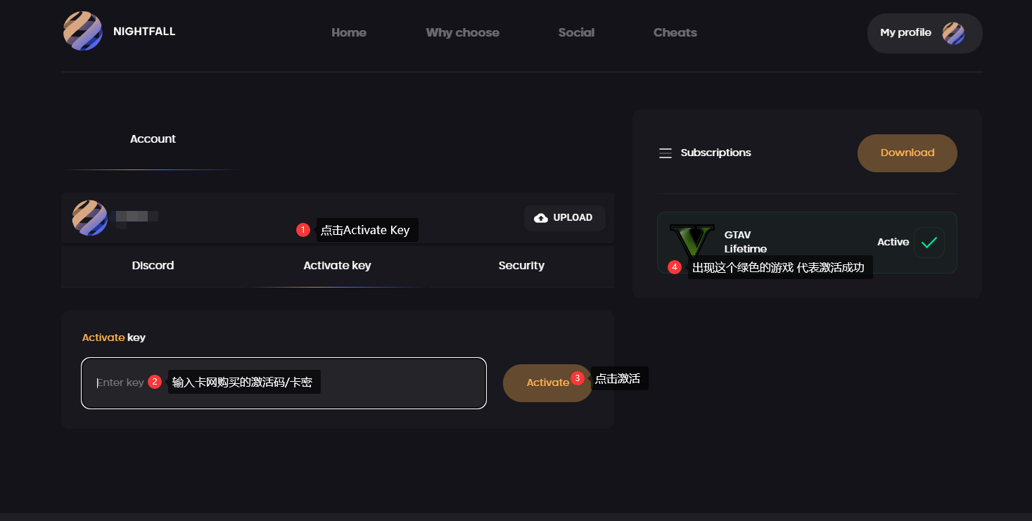 黄昏辅助注册激活教程 由gta6plus.com 2023年12月21日 第一步:注册激活账号 打开注册网址:https://nfcheats.com 注册自己的账号密码【不要带中文或特殊标点符号,仅支持 英文+数字】 注册好后,输入自己注册的账号密码,然后点击Login登入进去 登入进来后,点击右上角的My profile,再点击Account,然后看下图操作,框里输入购买的激活码,点击Activate激活